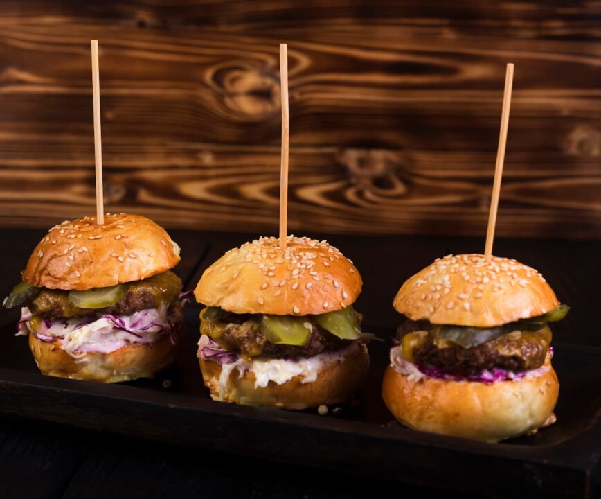 Disfruta nuestras deliciosas mini hamburguesa: Pan con ajonjolí, Carne de res 100%, Lechuga, Jitomate, Cebolla, Queso Gouda